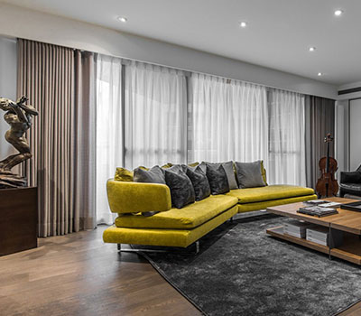 落地窗的窗飾設計一般可以采用電動開合簾、電動卷簾、電動蜂巢簾、電動柔紗簾等,既遮陽又美觀,操作簡單,方便控制室內光線。